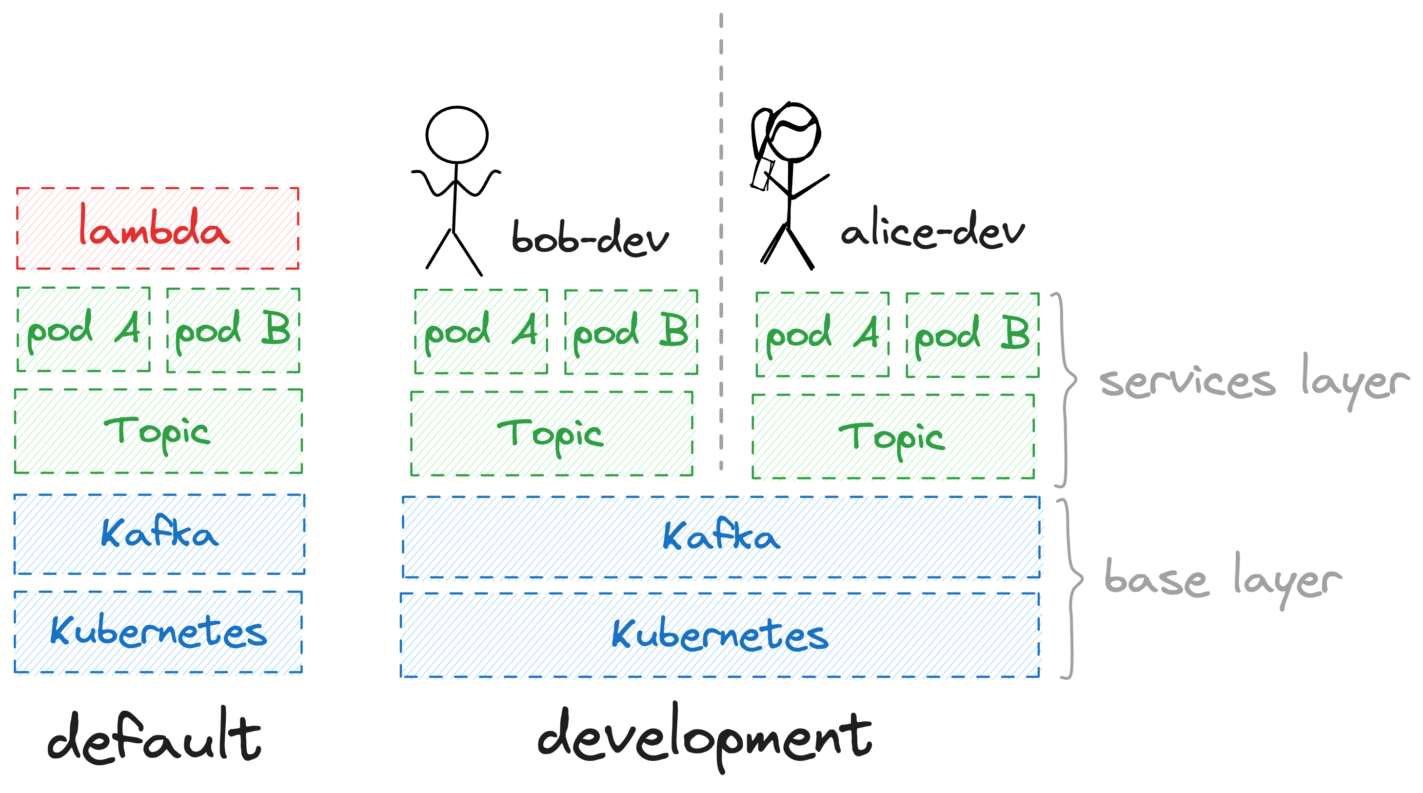 Layers make it easy for engineers to create their own development environments while sharing core-pieces of infrastructure. When using Layerform, engineers can encapsulate different types of development environments into layers, and each engineer can spin up the layers they need for developing and testing their applications.
