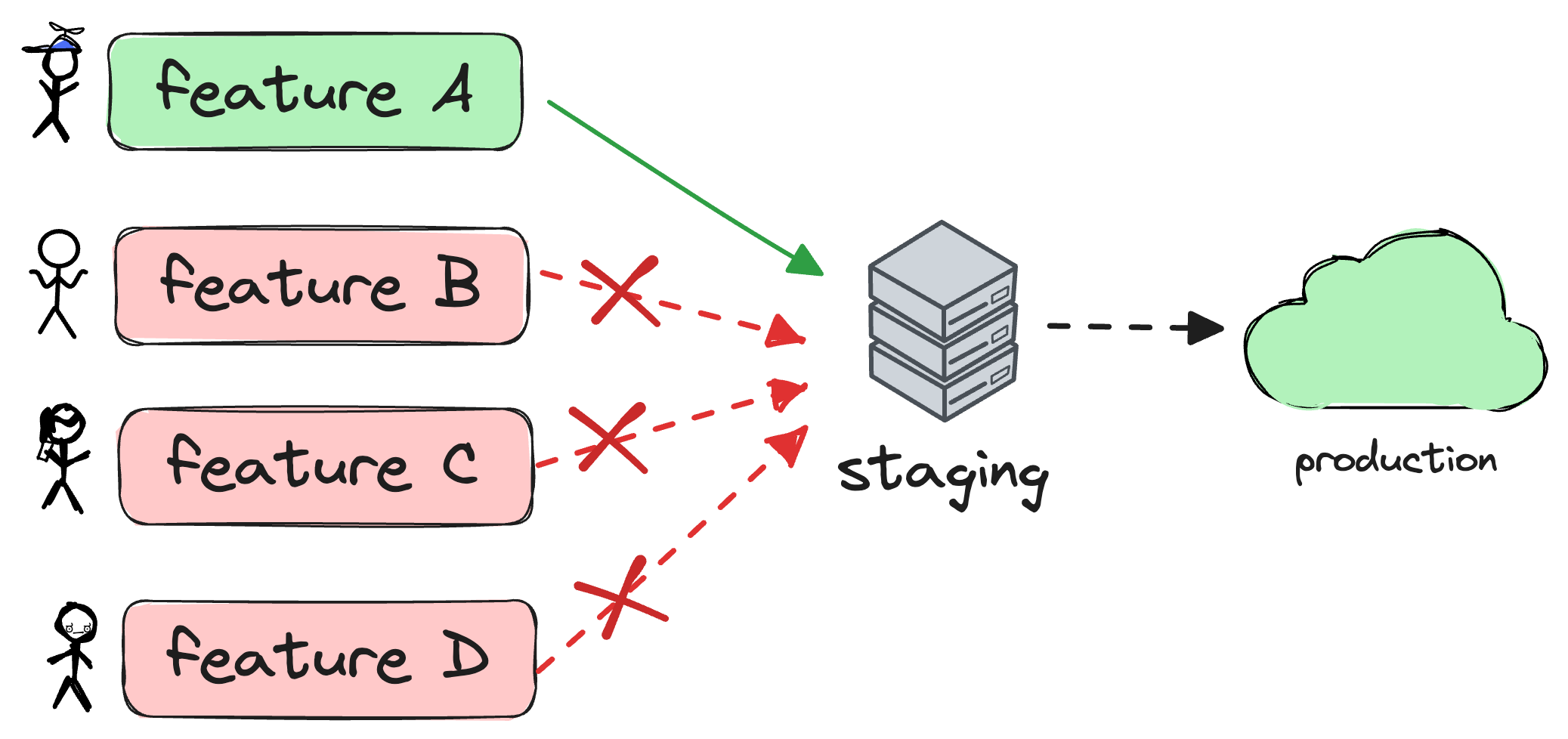 Most companies have a single or too few “staging” environments. Therefore, engineers scramble to see who will use staging or end up merging changes without ever testing them in a production-like environment. Consequently, bugs slip, and there’s a lot of rework to rollback changes and apply fixes after broken code has been merged.